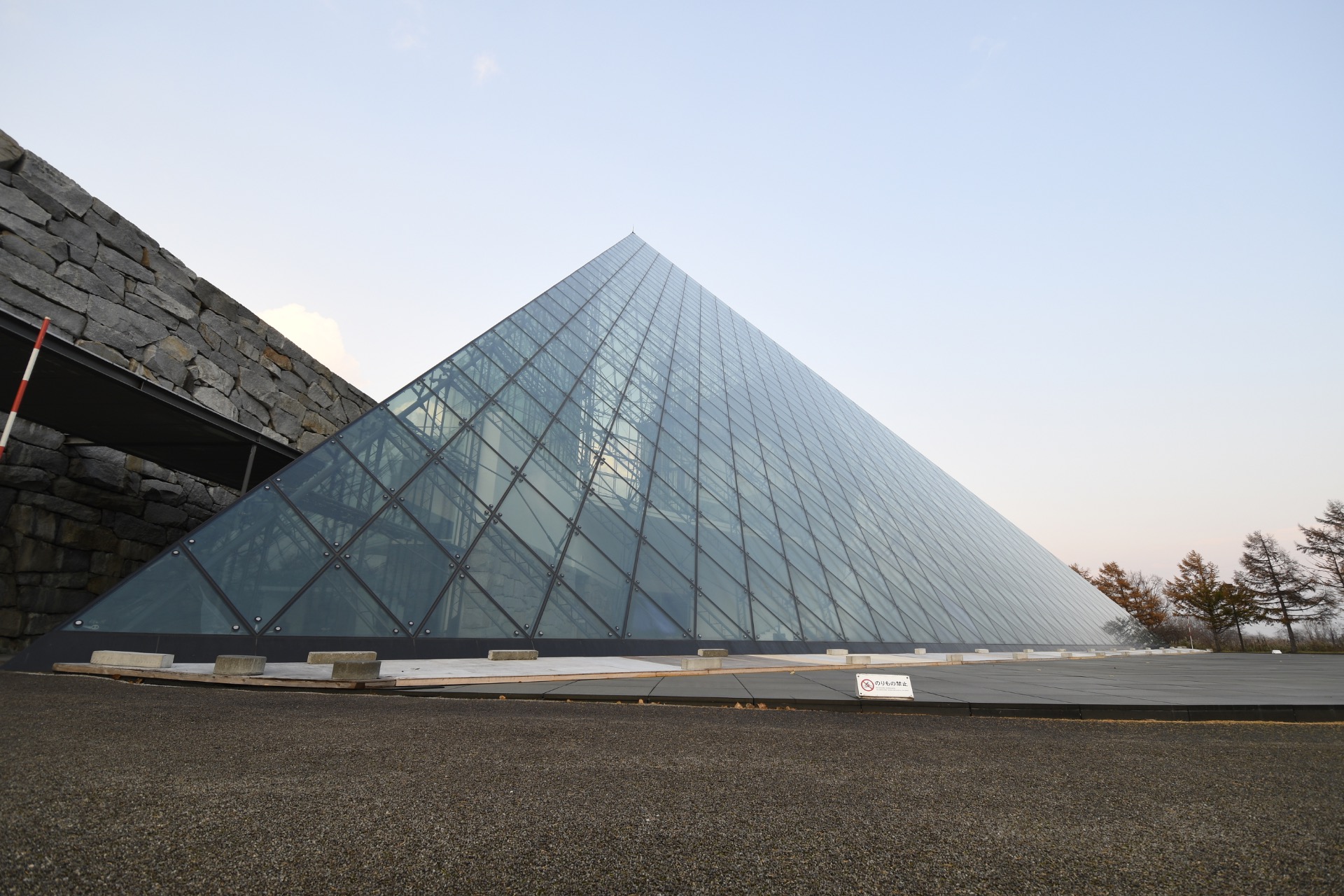 ノグチがどういう設計思想で公園のグラウンド全体を設計したのかは分からないですが、自式風水の場合は山なら山、この場合は緩い山ですね。ガラス材質のピラミッドと、配置の意義を検討します。