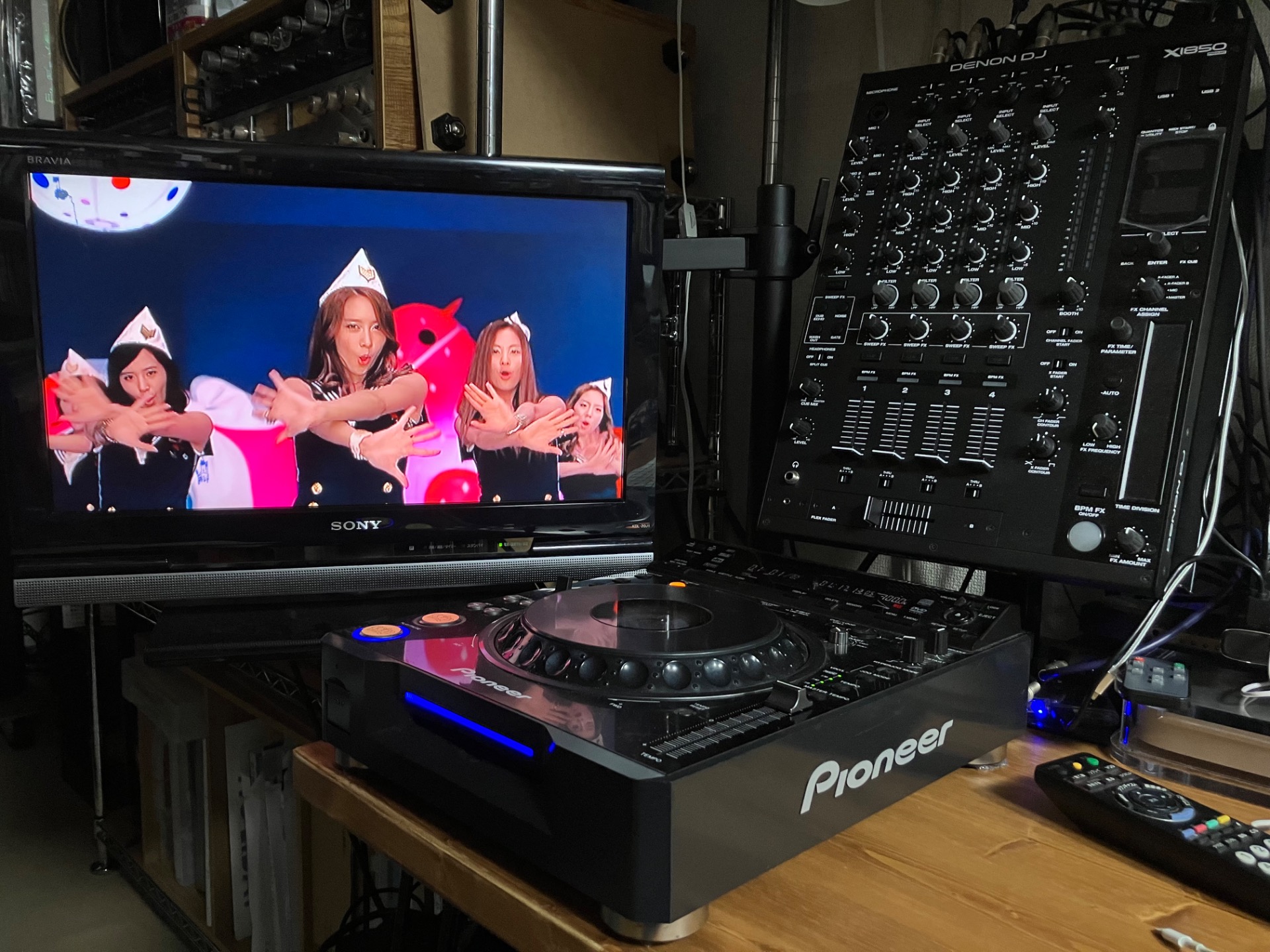 ↑これは私のデスク周りなんだけど、DJミキサーの近くに、サブモニターとDVJ1000を置いたんだ。椅子に座りながら左手でスクラッチ出来る感じ。必要ならば写真のサブモニターからメインモニターに出力出来るけど、あんまりないかな。別に映画見るとかだったら他のプレイヤーを使うからね。